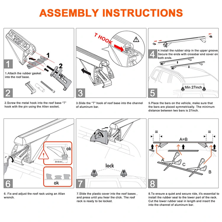 Ces barres transversales de galerie de toit sont faciles à installer : clé hexagonale incluse pour une installation de 10 minutes ; manuel avec des illustrations étape par étape.